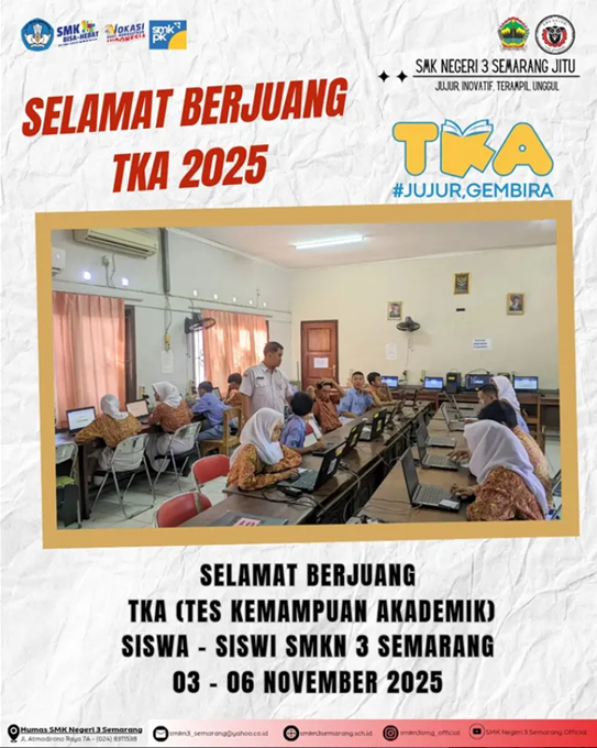 Semarang, 1 November 2025 — Gengs, besok adalah hari pembuktian! Tim SMKN 3 Semarang siap menunjukkan semangat juang dan mental juara dalam pelaksanaan Tes Kompetensi Akademik (TKA). Biar semuanya lancar tanpa drama, pastikan tiga hal penting ini sudah kamu catat, ya!