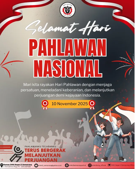 Semarang, 10 November 2025 – Suasana khidmat menyelimuti upacara peringatan Hari Pahlawan ke-80 yang digelar di Lapangan SMK Negeri 3 Semarang, Senin (10/11/2025). Peringatan tahun ini mengambil momentum untuk merefleksikan kembali arti perjuangan di era modern, sejalan dengan visi pembangunan nasional.