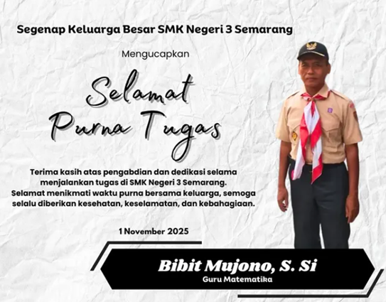 Kami menyampaikan terima kasih yang sebesar-besarnya atas seluruh pengabdian, semangat, dan kontribusi yang telah Bapak berikan selama menjadi bagian dari keluarga besar SMKN 3 Semarang.