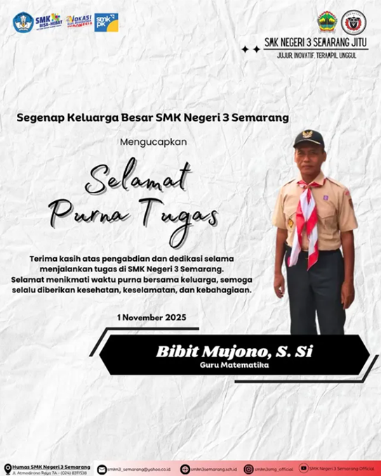 Kami menyampaikan terima kasih yang sebesar-besarnya atas seluruh pengabdian, semangat, dan kontribusi yang telah Bapak berikan selama menjadi bagian dari keluarga besar SMKN 3 Semarang.
