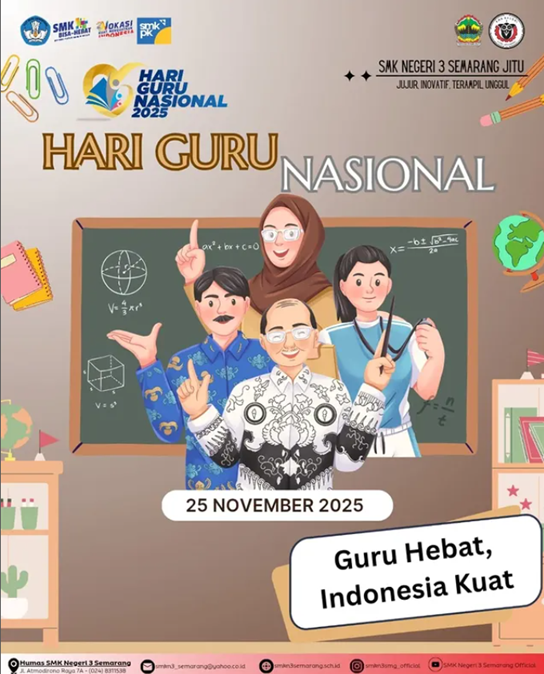 Dalam rangka memperingati Hari Guru Nasional yang jatuh pada tanggal 25 November, SMK Negeri 3 Semarang menyelenggarakan upacara bendera sebagai bentuk penghormatan kepada para pendidik yang telah mendedikasikan diri dalam mencerdaskan generasi bangsa.