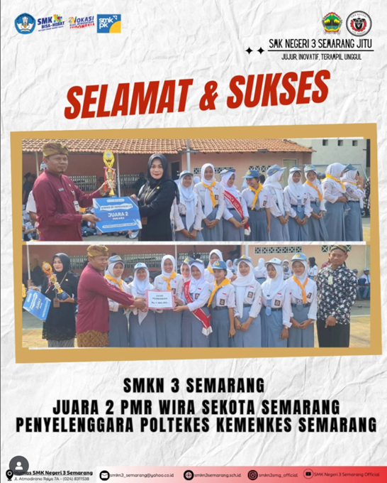Semarang, 24 November 2025  — Prestasi membanggakan kembali diraih oleh keluarga besar SMKN 3 Semarang. Tim PMR WIRA SMKN 3 Semarang berhasil meraih Juara 2 dalam Lomba PMR WIRA se-Kota Semarang yang diselenggarakan oleh Poltekkes Kemenkes Semarang.