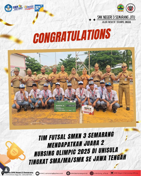 Prestasi membanggakan kembali diraih oleh SMK Negeri 3 Semarang. Kali ini, Tim Futsal SMKN 3 Semarang berhasil meraih Juara 2 dalam ajang Nursing Olympic 2025 yang diselenggarakan oleh Universitas Sultan Agung (UNISULA) Semarang. Kompetisi ini diikuti oleh tim-tim futsal dari berbagai SMA, MA, dan SMK se-Jawa Tengah, menjadikannya ajang bergengsi antar pelajar tingkat provinsi.